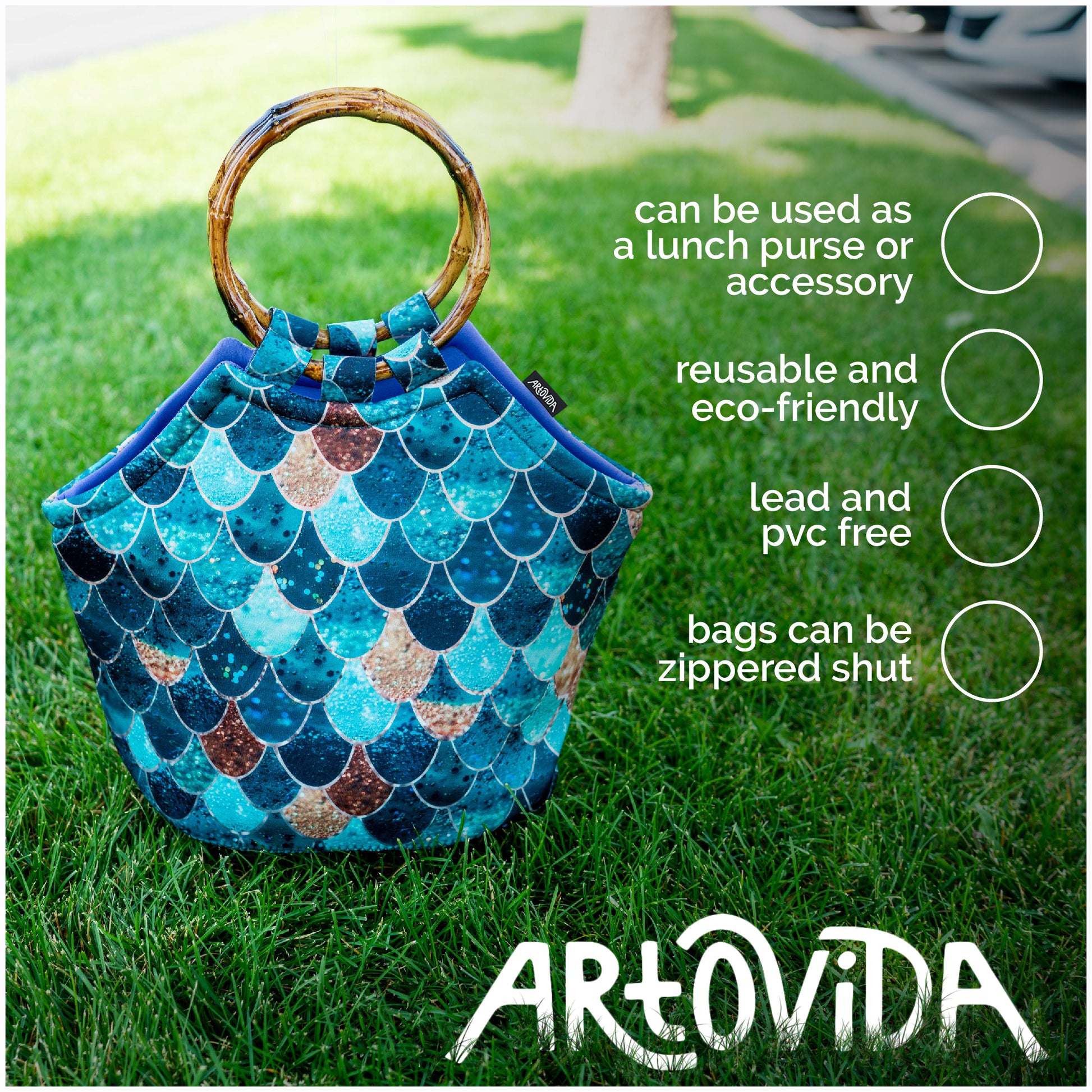 - REUSABLE, ECO-FRIENDLY AND FASHIONABLE - Helps you look good while doing your part in protecting the environment by not throwing away paper and plastic bags. This DESIGNER LUNCH PURSE has a LARGER HANDLE with a BAMBOO LOOK that will fit over your arm or shoulder